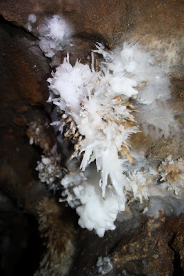 Nous y resterons plus de 2 heures à faire des prises de vues films et photos: méandre avant le siphon, gouttes d'eau qui s'éclatent sur une stalagmite, galerie avec la grande coulée, aragonites, gours, salle du haut, etc.......